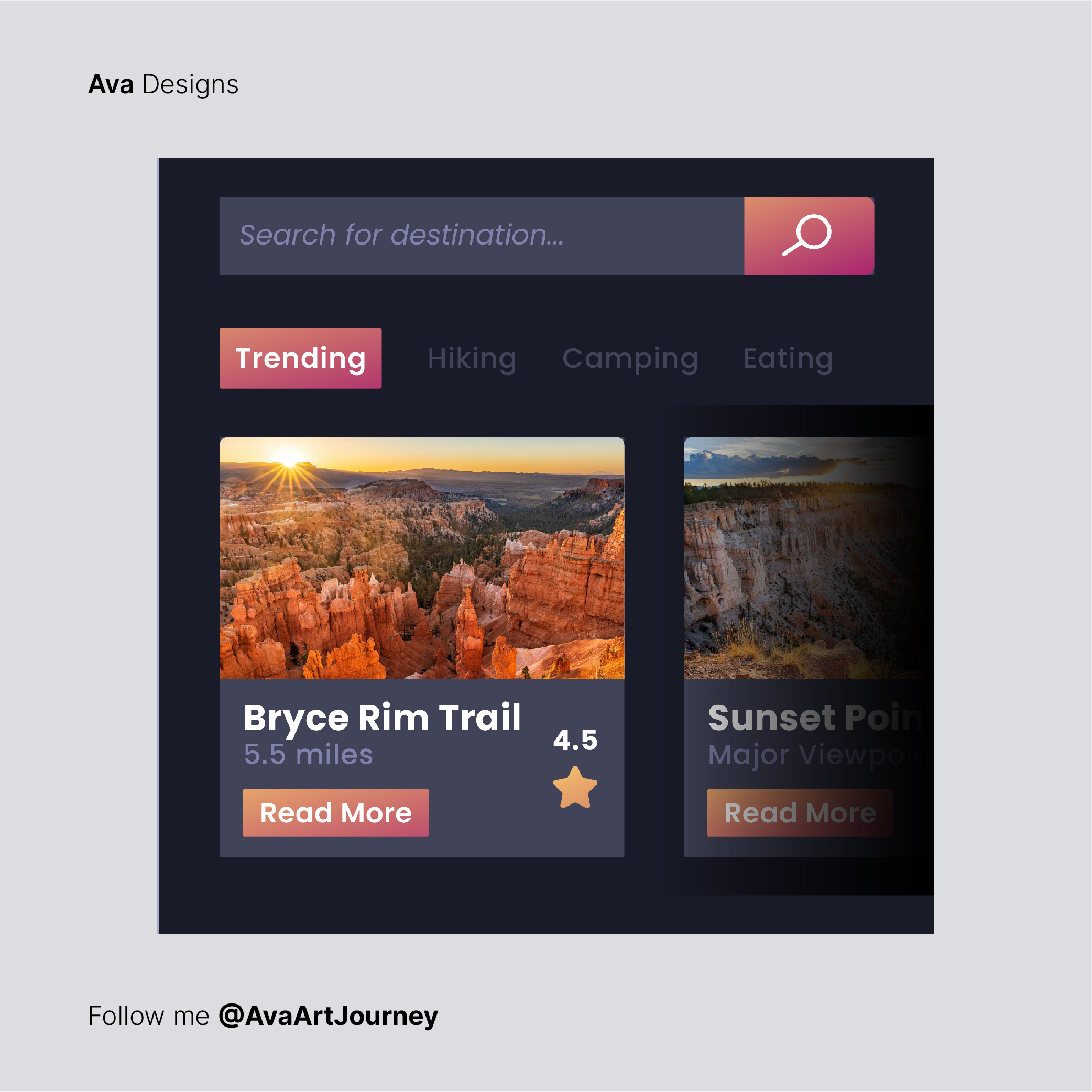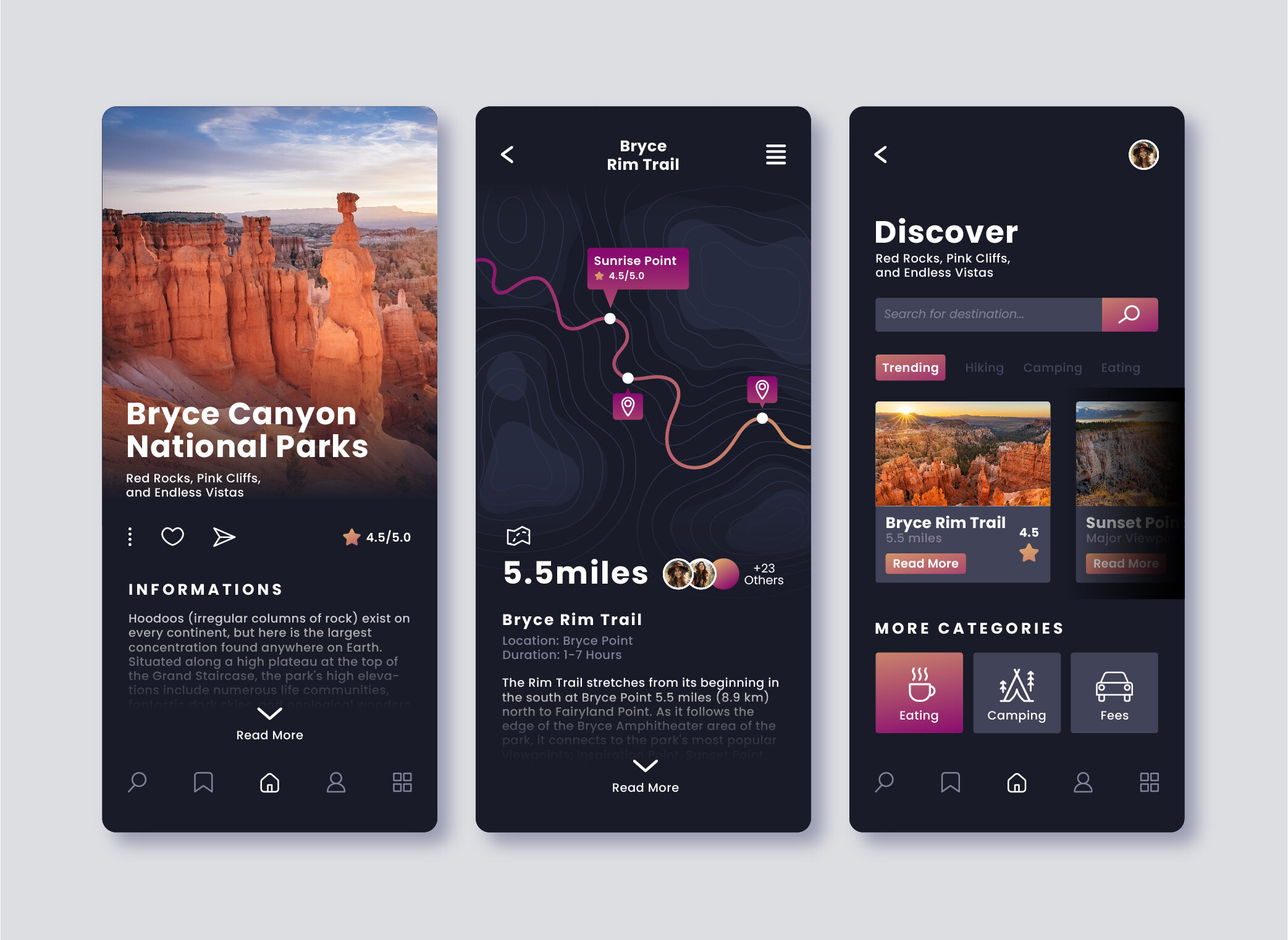 Starting from user flow mapping and wireframing, the UI design focused on clarity, accessibility, and visual inspiration. A clean card-based layout, nature-inspired color palette, and intuitive tab navigation (e.g., Trending, Hiking, Camping, Eating, Fees) were developed to mirror the experience of exploring the park in person.